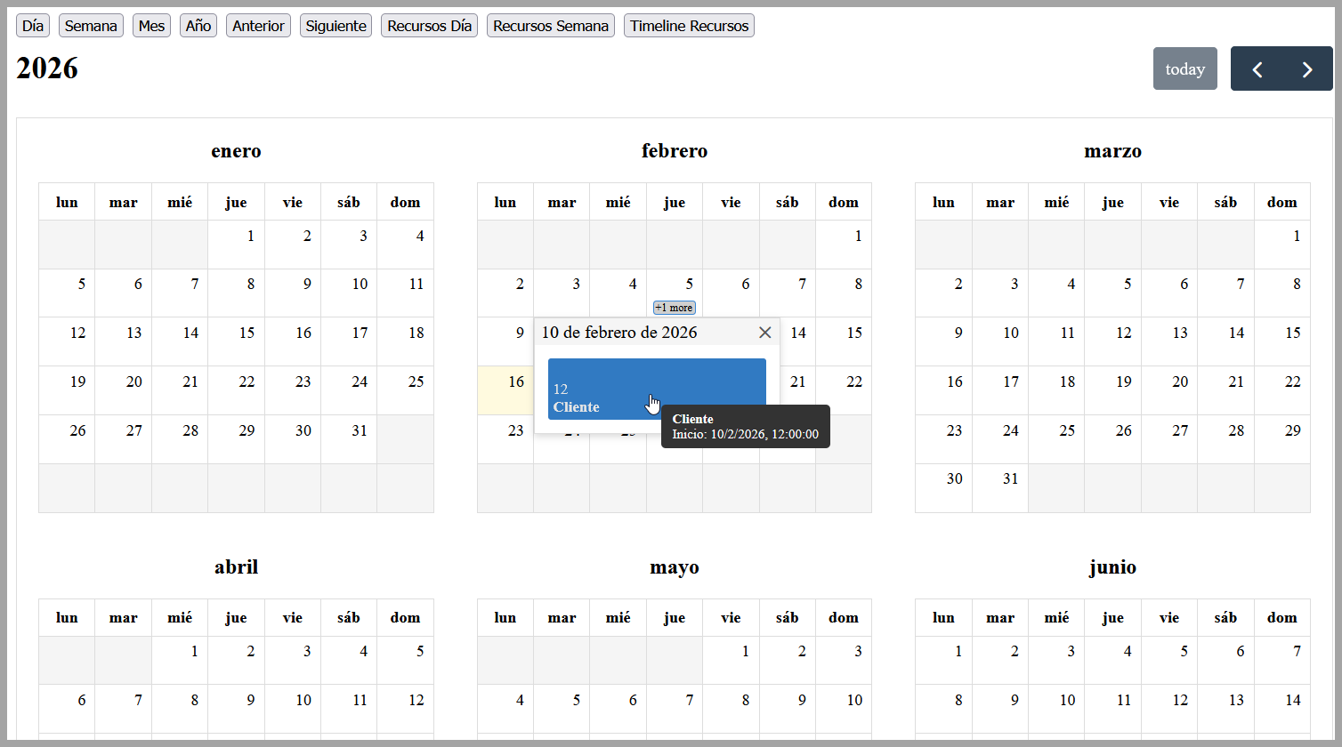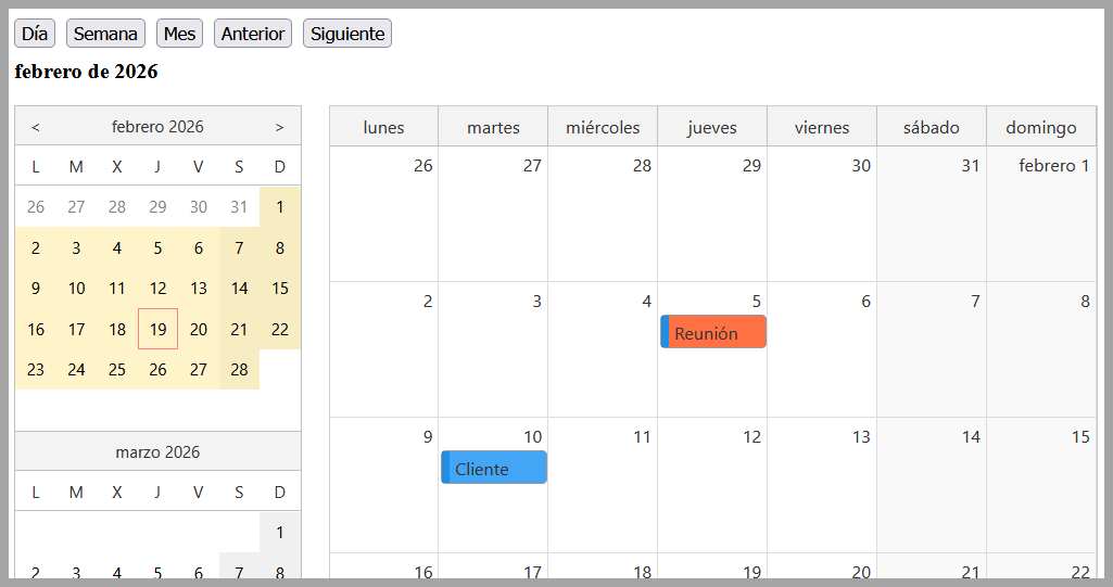 - Definición de calendario de día, semana y mes, disponiendo de una guía de 3 meses para poder navegar entre fechas.