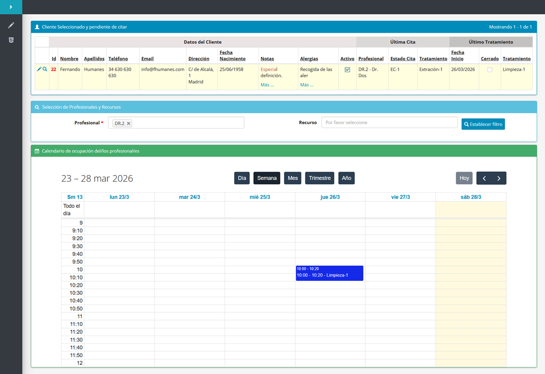 - – Haciendo clic en el día y horario solicitado, se abre la ventana de la cita en la que ya está por defecto el nombre del Cliente y si en la selección del profesional, sólo se fijó uno, también, sale seleccionado ese profesional, Se indica la actividad y con ello, viene el tiempo que se estima para hacer dicha actividad y se actualiza la nueva cita, quedando actualizado calendario y los datos de última cita del Cliente.