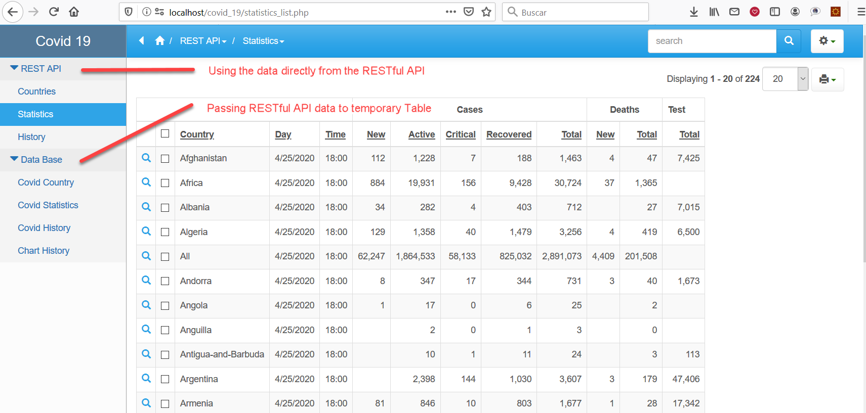 - Statistics. Facilita la situación actual de Covid 19 en todos los países.